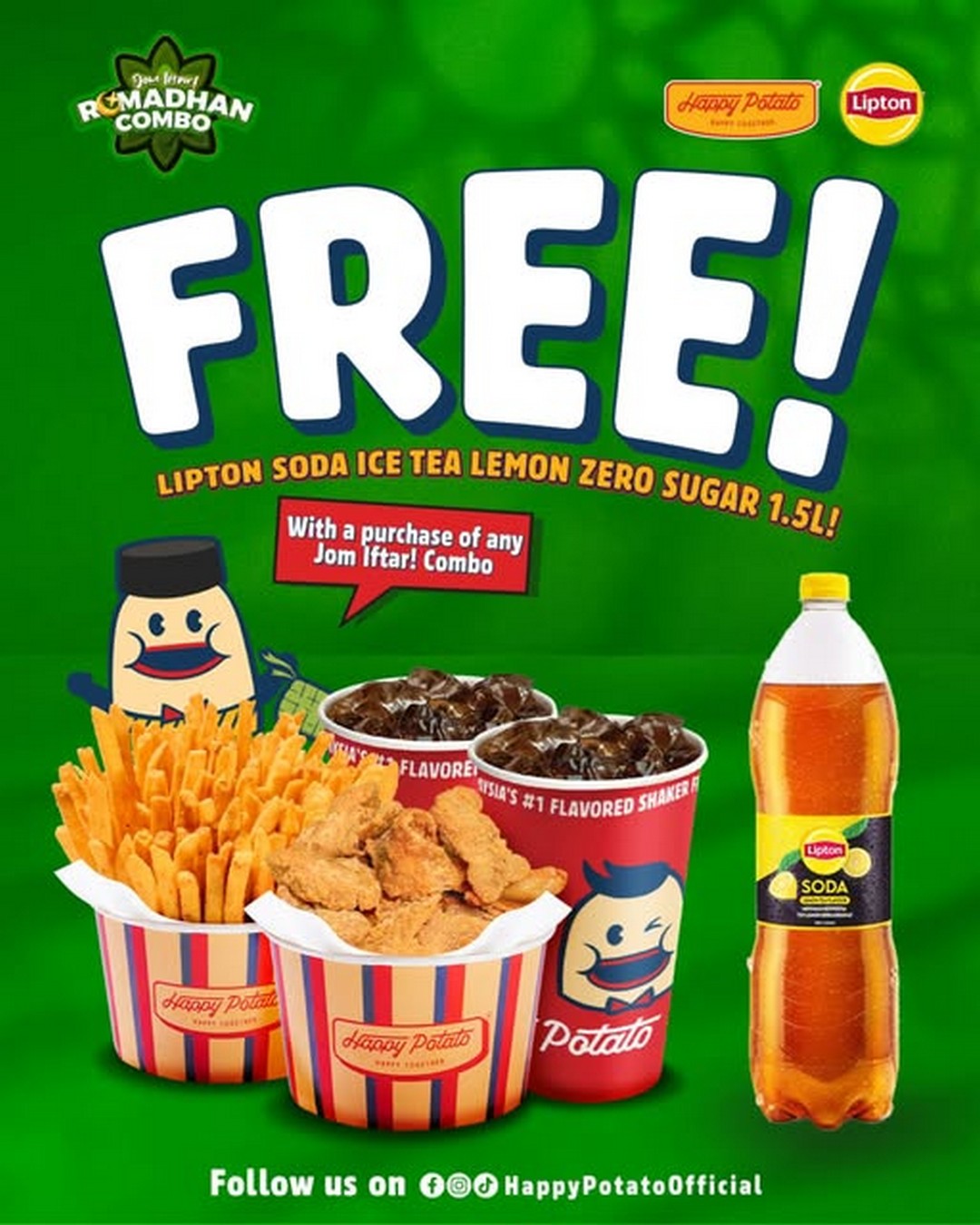 Ramadhan is a time for reflection, togetherness, and of course, satisfying meals after a long day of fasting. This year, Happy Potato is making your Iftar gatherings even more enjoyable with a refreshing twist. For those who love ending their fast on a sweet and fizzy note, they are offering a FREE 1.5L Lipton Soda Ice Tea Lemon Zero Sugar when you purchase any Iftar combo at their selected outlets. It’s the perfect way to stay hydrated and enjoy a delicious treat with friends and family.