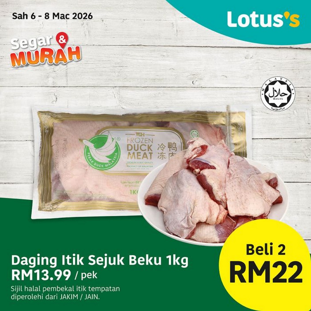 Meat lovers are not left out either. Lotus’s has a selection of premium meats at tempting prices. The Potongan Daging Kerbau Sejuk Beku 900gm is priced at RM15.99 per pack, perfect for hearty stews or grilled dishes. Duck fans can enjoy Daging Itik Sejuk Beku 1kg at RM13.99 per pack, or even better, buy two packs for just RM22 during the promotion period. These deals not only help families stretch their budget but also provide the convenience of having ready-to-cook frozen meat on hand for those busier days.