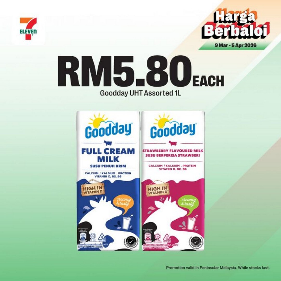Goodday UHT Assorted Milk 1L cartons are priced at RM5.80 for Peninsular Malaysia outlets, making them suitable for families who enjoy milk with desserts or cereals.