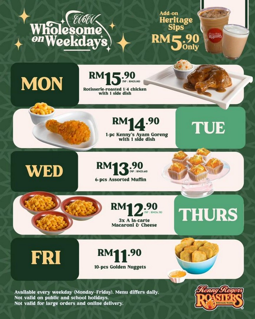 While the brand has not provided specific dates, the Wholesome on Weekdays promotion runs every weekday, from Monday to Friday, at Kenny Rogers ROASTERS restaurants nationwide. However, a few locations are excluded from this promotion, namely Kulim, PKNS, Cameron Highlands, Angsana, Bahau, Jasin, and Kemaman. It’s worth confirming with the nearest outlet to ensure participation.
