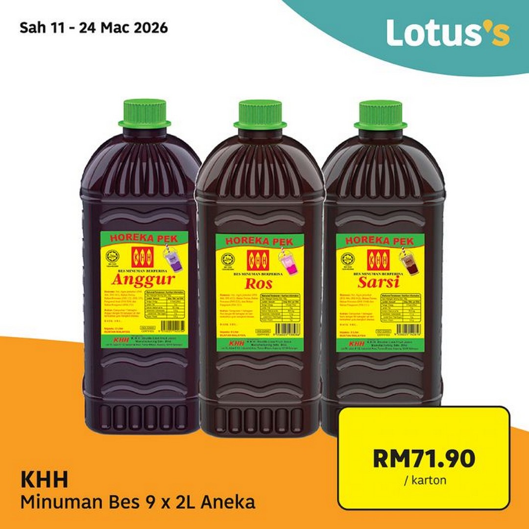 Beverages are another category included in the promotion. Customers can purchase KHH Minuman Bes (Anggur, Ros, Sarsi) at RM71.90 per carton, which contains 9 bottles of 2 litres each in assorted flavours. These drinks are commonly served during gatherings, making them a suitable option for households expecting guests during Ramadan evenings.