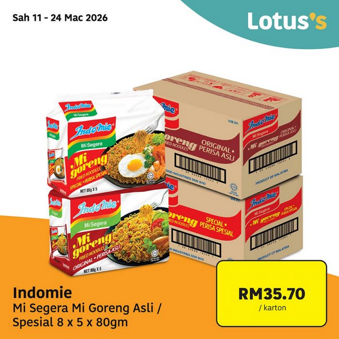 Beyond fresh ingredients, the promotion also features several pantry staples that many Malaysian households rely on regularly. One of the most recognisable brands included is Indomie Mi Segera Mi Goreng Asli / Spesial.