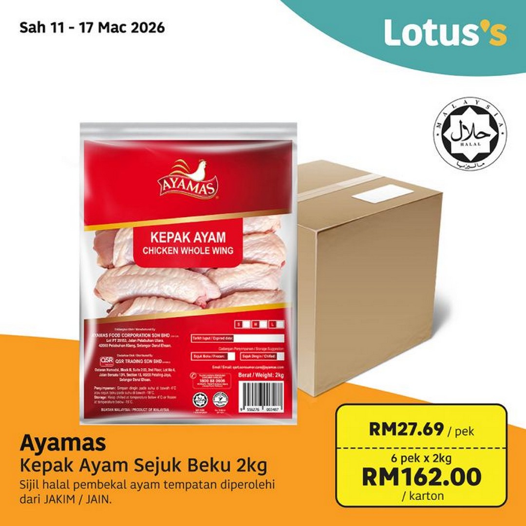 Chicken wings are another favourite, especially for quick dishes or snacks during moreh. Lotus’s is also featuring Ayamas Kepak Ayam Sejuk Beku 2kg at RM27.69 per pack, while customers who prefer to buy in cartons can pick up six packs (2kg each) for RM162.00 per carton. These wings are ideal for a variety of dishes, from grilled wings to spicy sambal preparations.