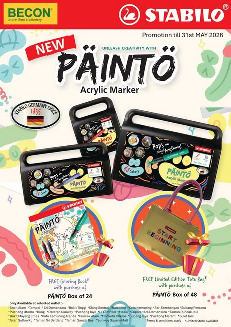 Becon Stationery has introduced a special gift-with-purchase promotion featuring the popular STABILO PAINTO Acrylic Markers. Instead of a standard discount, they are rewarding shoppers with creative freebies that make the deal even more enjoyable. Depending on the marker set purchased, customers can walk away with either a free colouring book or a limited edition tote bag.