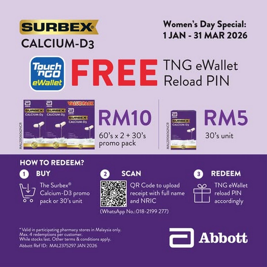 Women’s Day is the perfect opportunity to treat yourself or the special women in your life, and Mega Kulim Pharmacy in Malaysia has just the right incentive to make it even more exciting. For a limited time, they are offering an exclusive promotion on Surbex Calcium products, giving customers the chance to earn free Touch ‘n Go (TNG) reload PINs while supporting their bone health.