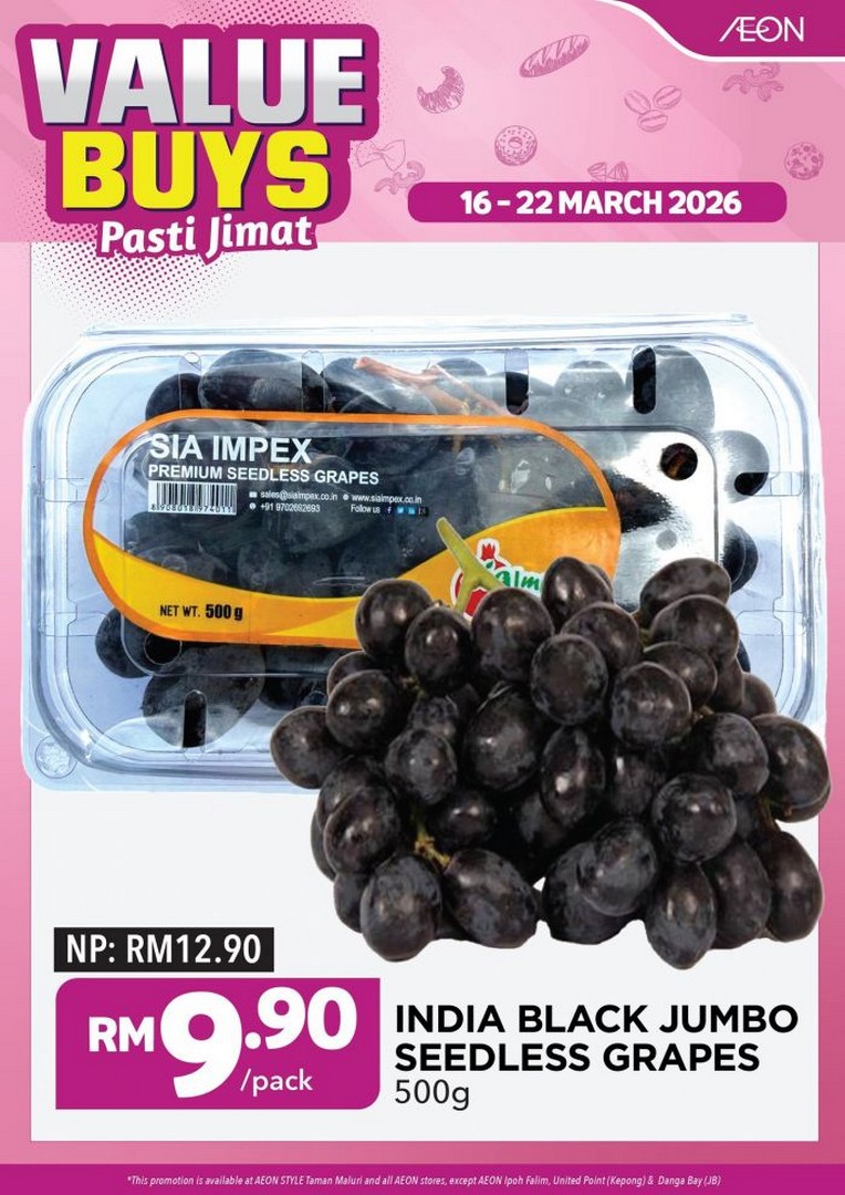 Offers: India Black Jumbo Seedless Grapes 500g – RM9.90, Marinated Lamb Chump Chop – RM4.89/100g -