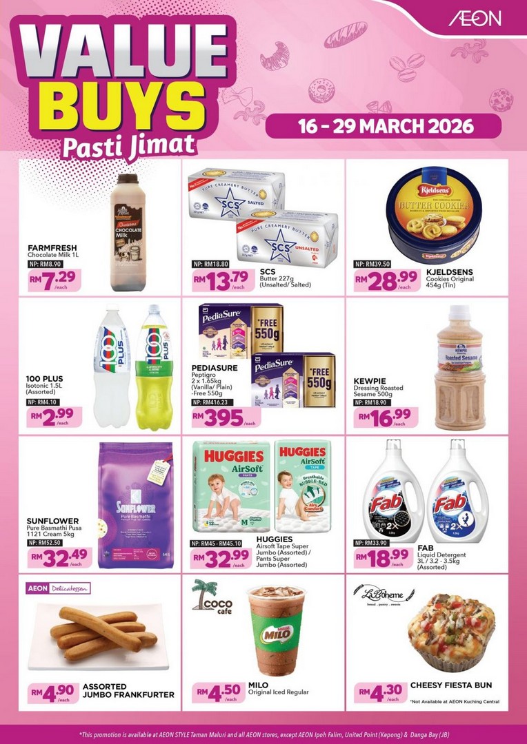 Offers: FarmFresh Chocolate Milk 1L – RM7.29, SCS Butter 227g – RM13.79, Kjeldsens Cookies 454g – RM28.99, 100 Plus Isotonic 1.5L – RM2.99, PediaSure Peptigro 2 x 1.65kg + Free 550g – RM395.00, Kewpie Dressing 500g – RM16.99, Sunflower Pure Basmathi 5kg – RM32.49, Huggies AirSoft Tape/Pants Super Jumbo – RM32.99, Fab Liquid Detergent 3L – RM18.99, AEON Delicatessen & Café items