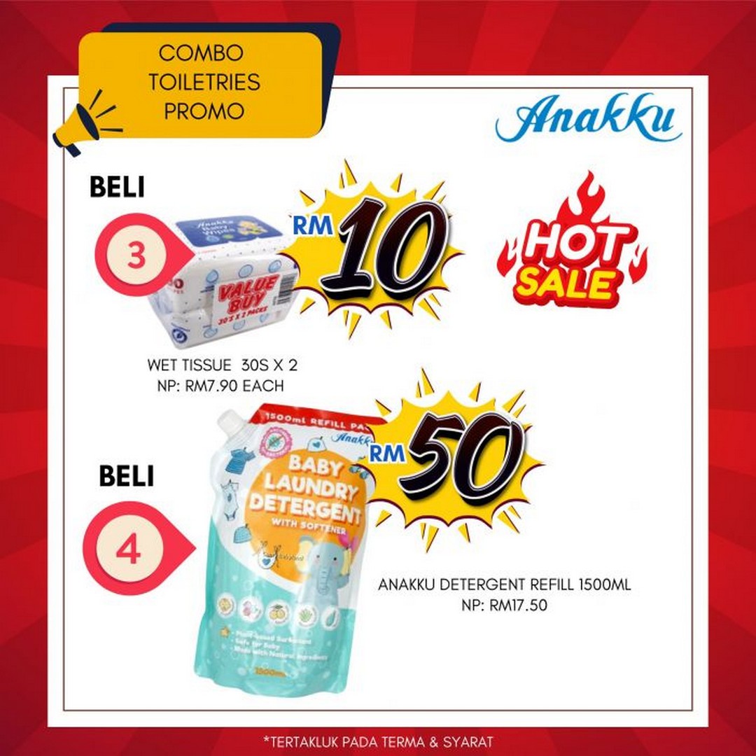 Among the standout deals is the Anakku Wet Tissue combo, where shoppers can purchase three packs (30 sheets x 2 packs each) for RM10, compared to the usual price of RM7.90 per pack. This is a significant saving, especially for parents who go through wipes daily.