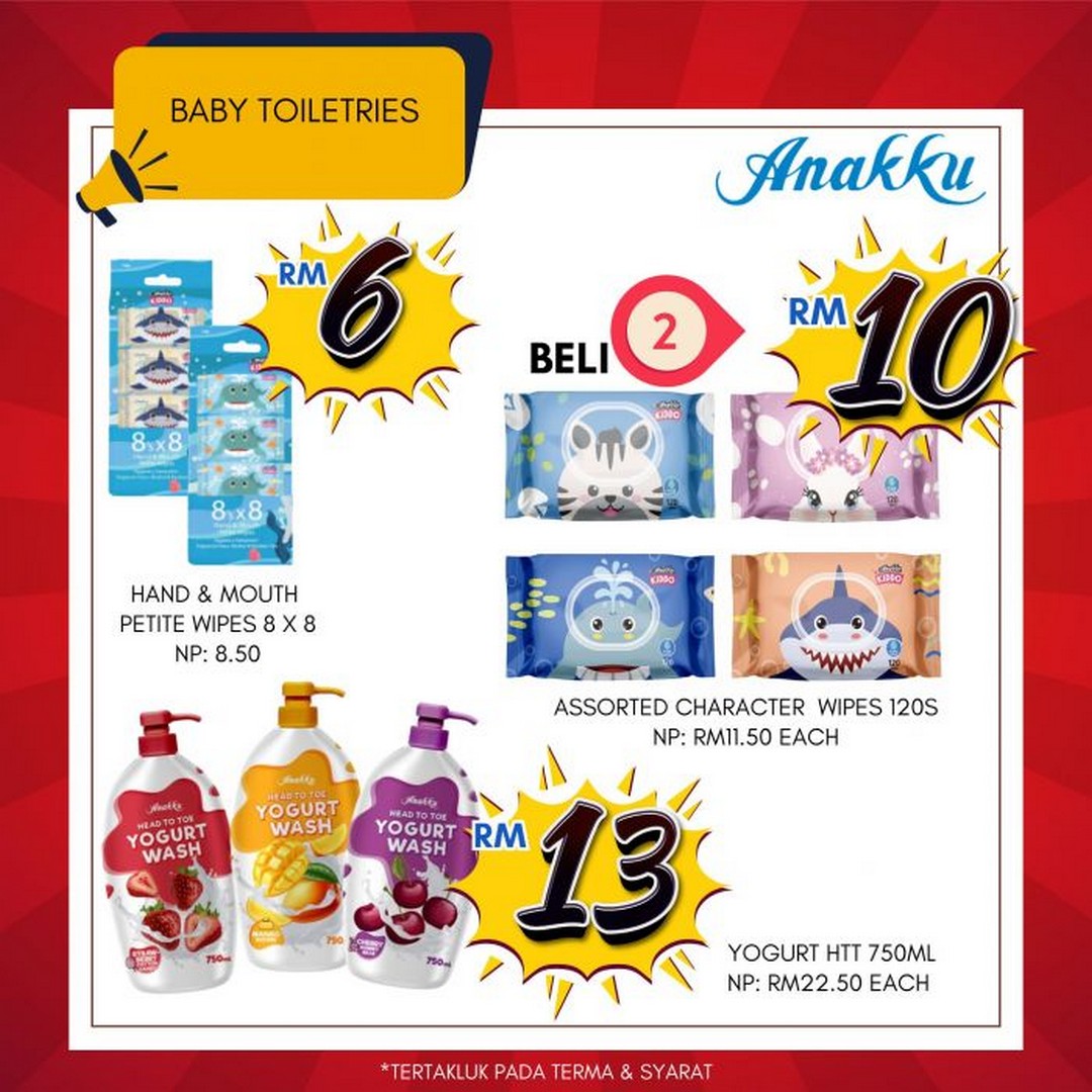 For added variety, there are also Kiddo Hand & Mouth Petite Wipes and assorted character wipes available at bundle prices, along with the Anakku Yogurt Head To Toe Wash (750ml) going for RM13 instead of the usual RM22.50. These deals make it possible to try different products without overspending.