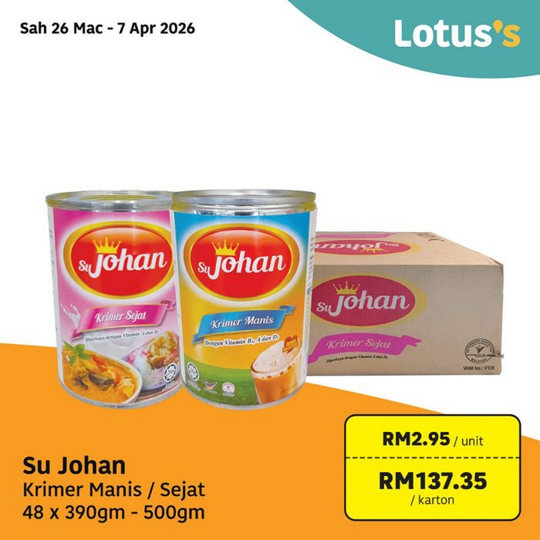 - Su Johan Creamer (Sweetened/Evaporated) 48x390g-500g – RM137.35 per carton. Essential for tea and coffee, these creamer packs can serve many cups of festive beverages.
