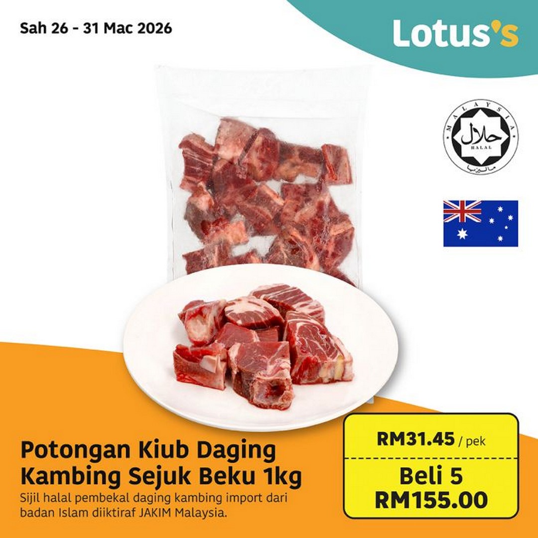 - Frozen Mutton Cubes 1kg – Buy 5 packs for RM155.00 (usual price RM31.45 per pack). These halal-certified cubes are a must-have for classic mutton curries or stew dishes.