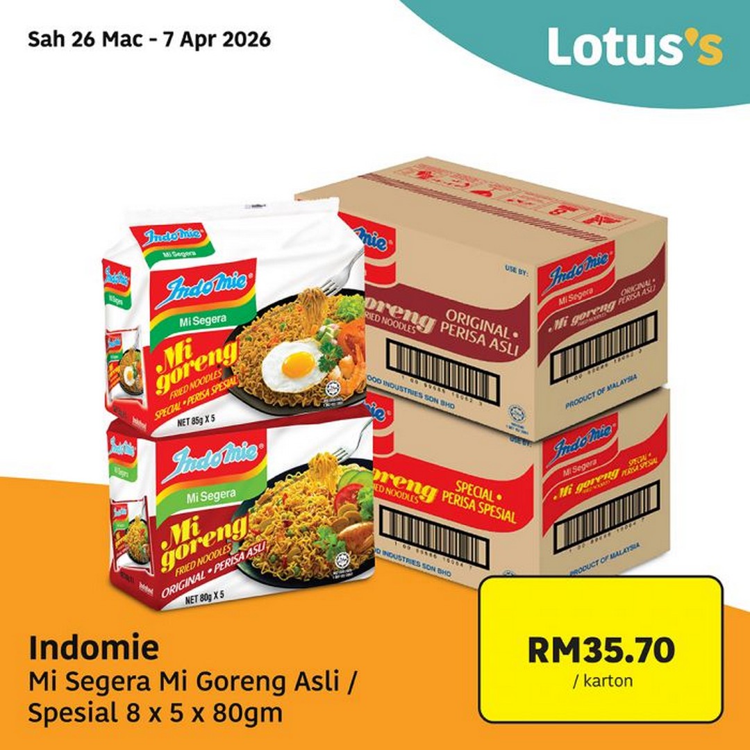- Indomie Mi Goreng (Asli/Spesial) 8x5x80gm – RM35.70 per carton. Instant noodles are a convenient option for quick meals during busy Raya preparations.