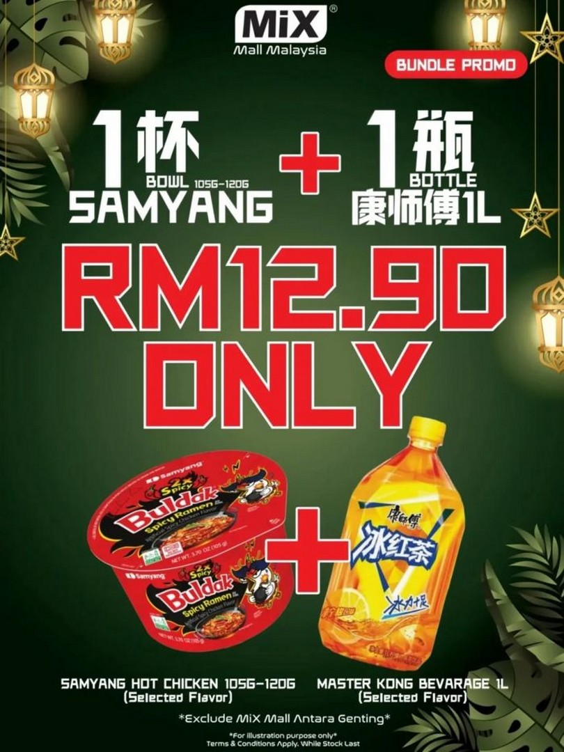 - Samyang Bundle – A hearty option for lunch or dinner: one bowl of Samyang Hot Chicken Ramen (105g-120g) plus one bottle of Master Kong Beverage (1L) for just RM12.90.