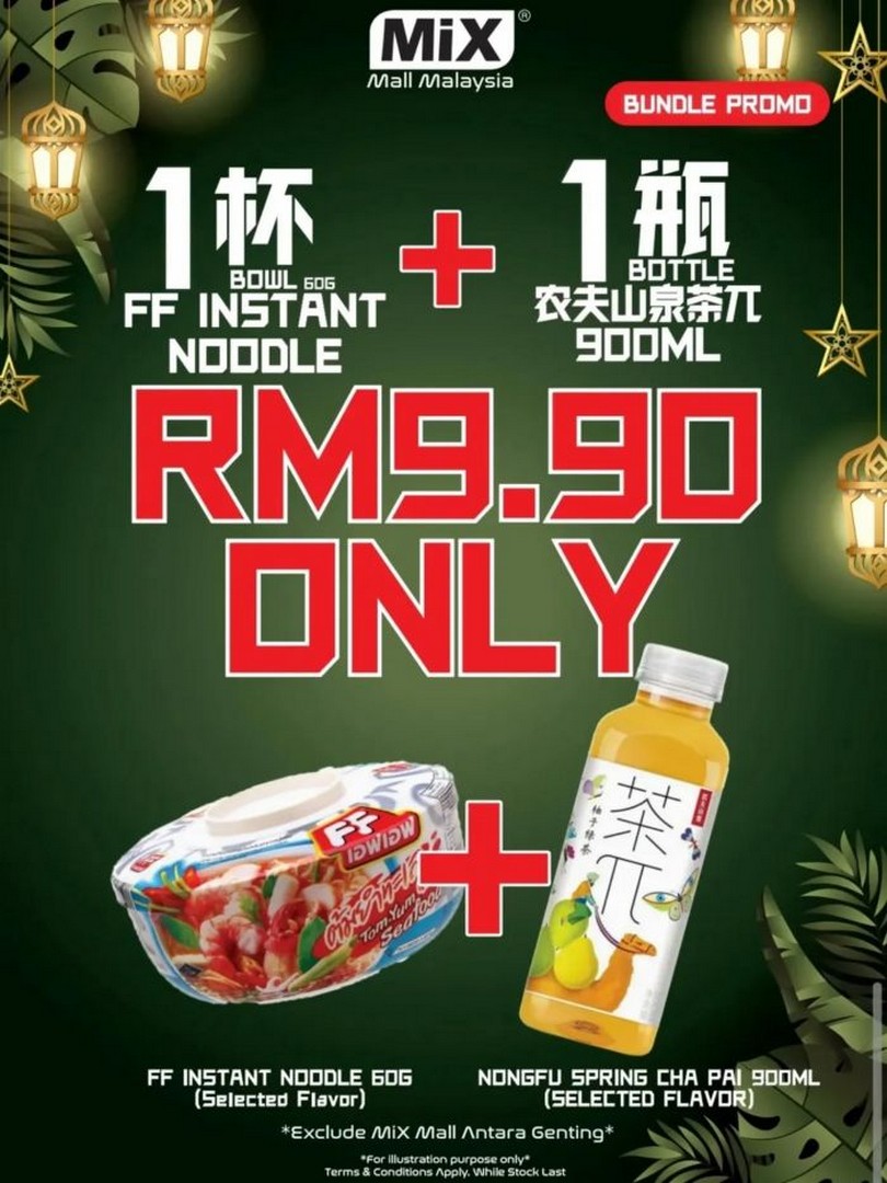 - FF Instant Noodle Bundle – One bowl of FF Instant Noodle (60g) paired with a 900ml bottle of Nongfu Spring Cha Pai for only RM9.90. Perfect for students, office workers, or anyone wanting a quick, filling meal at a bargain price.