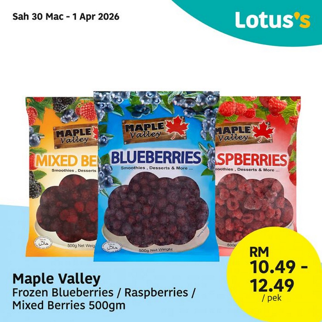 Yogurt lovers can enjoy the Marigold Yogurt Drink 700g at RM4.99 per unit or the Fernleaf Natural Yogurt 450g at RM5.89 per unit, both valid from 30 March to 1 April. For those who love adding a healthy, frozen fruit option to smoothies or desserts, Maple Valley Frozen Berries 500g are priced between RM10.49 and RM12.49 per pack, also valid from 30 March to 1 April.