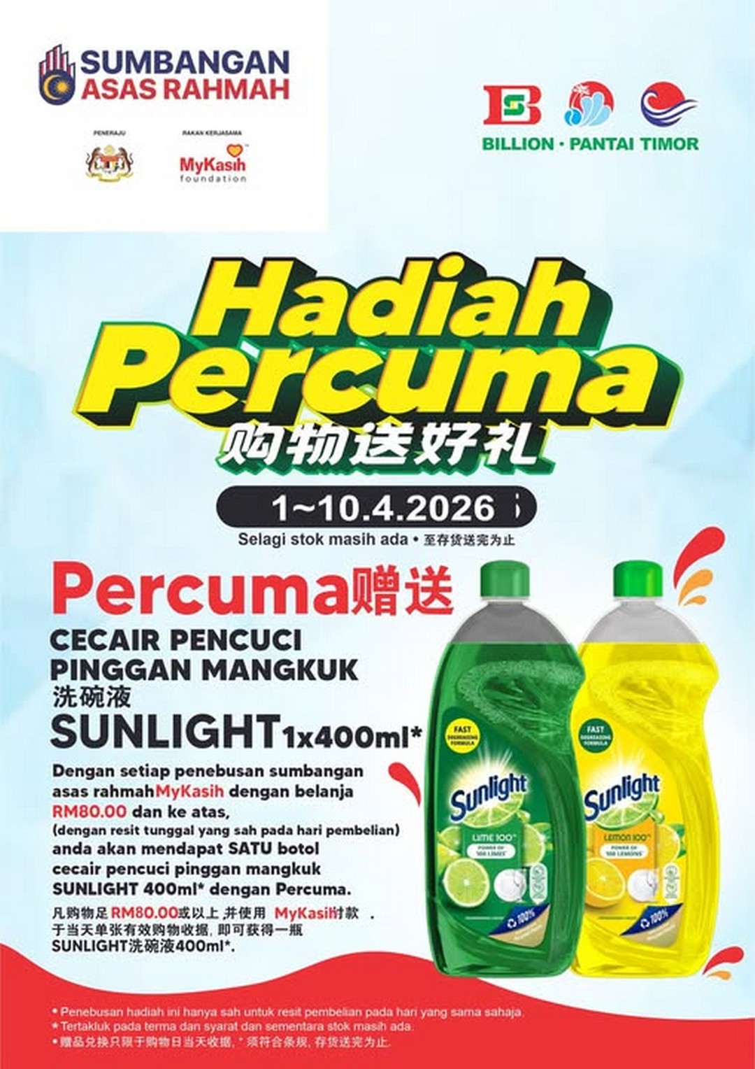 At first glance, it may seem like a straightforward freebie campaign. However, when they take a closer look, this promotion is actually quite meaningful, particularly for households that are stretching their ringgit wisely. With a minimum spend of RM80 in a single receipt, shoppers will receive a complimentary bottle of Sunlight 400ml dishwashing liquid. It is one of those deals that aligns perfectly with real household needs, making it both practical and worthwhile.