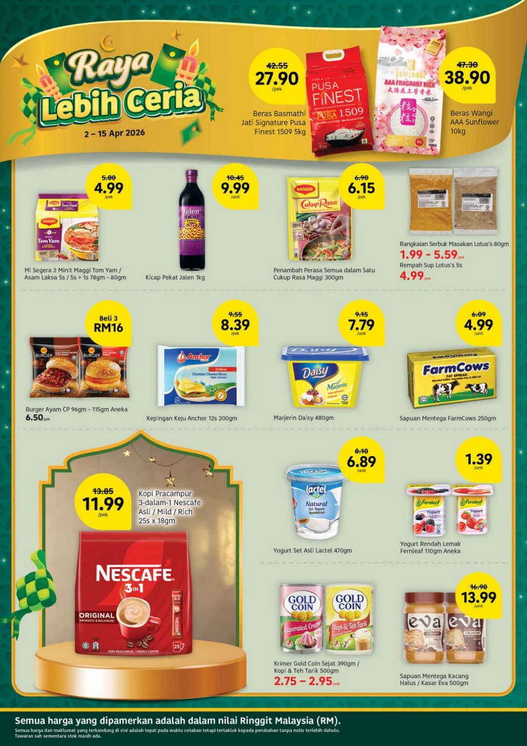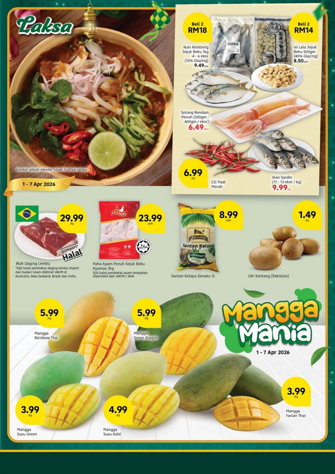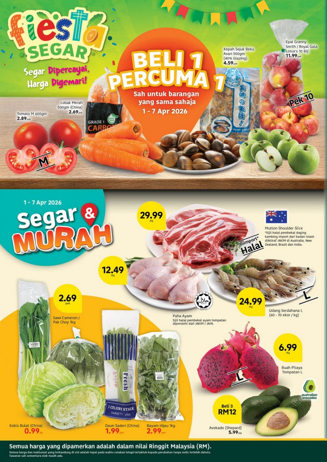 Starting with the first week, from 2 to 7 April 2026, shoppers can enjoy the “Segar & Murah” deals on fresh produce. This is the perfect opportunity to stock up on nutritious items while keeping the cost down. Selected items are available on a Buy 1 Free 1 basis, making it easy to plan meals for the week without worrying about budget constraints. Highlights include frozen Kepah (clams) and crisp Epal Granny Smith, which are perfect for healthy snacks or desserts. Seafood lovers will appreciate the Halal Mutton Shoulder Slice at RM29.99/kg and medium-sized prawns at RM24.99/kg. For vegetables, options such as Bayam Hijau, Daun Saderi, and Sawi Cameron start from just RM0.99 per pack, making them incredibly affordable for families aiming to eat fresh and green.