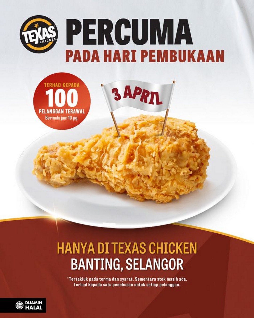To kick off their Banting debut in style, Texas Chicken has lined up a series of exciting giveaways for their opening day on 3 April 2026. Early birds and loyal fried chicken enthusiasts are in for a real treat. Here’s what they can expect: