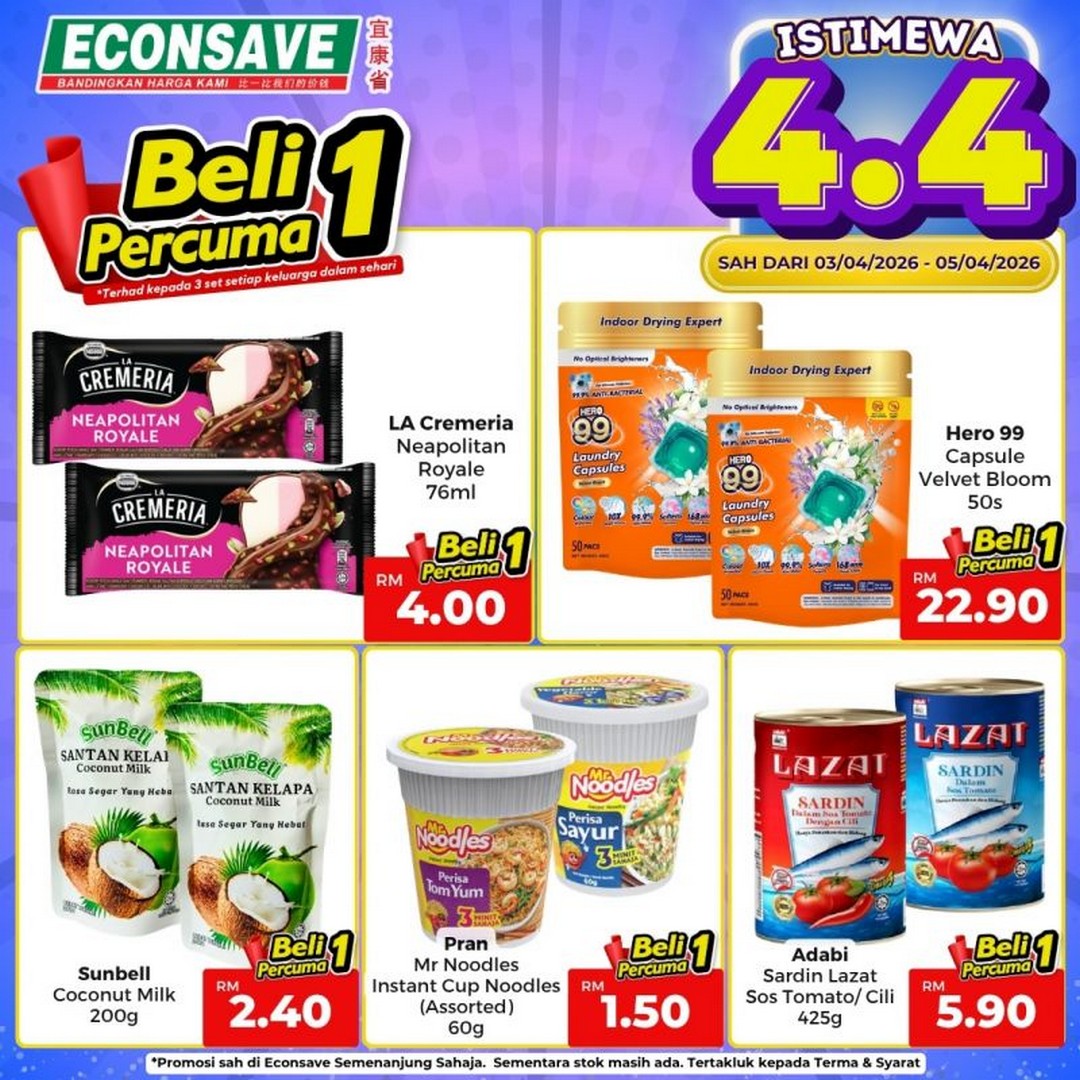 In short, the Econsave Istimewa 4.4 Promo is a rare chance to enjoy extensive savings across multiple categories of products. With a mix of Buy 1 Free 1 offers, RM4 and RM10 deals, and high-quality brands available at unbeatable prices, this is more than just a promotion—it’s a celebration of smart shopping. Make sure to mark your calendars, plan your shopping list, and head to Econsave outlets across Peninsular Malaysia from 3rd to 5th April 2026 to secure these amazing deals. Don’t miss out on the opportunity to stock up, save big, and make everyday shopping more enjoyable.