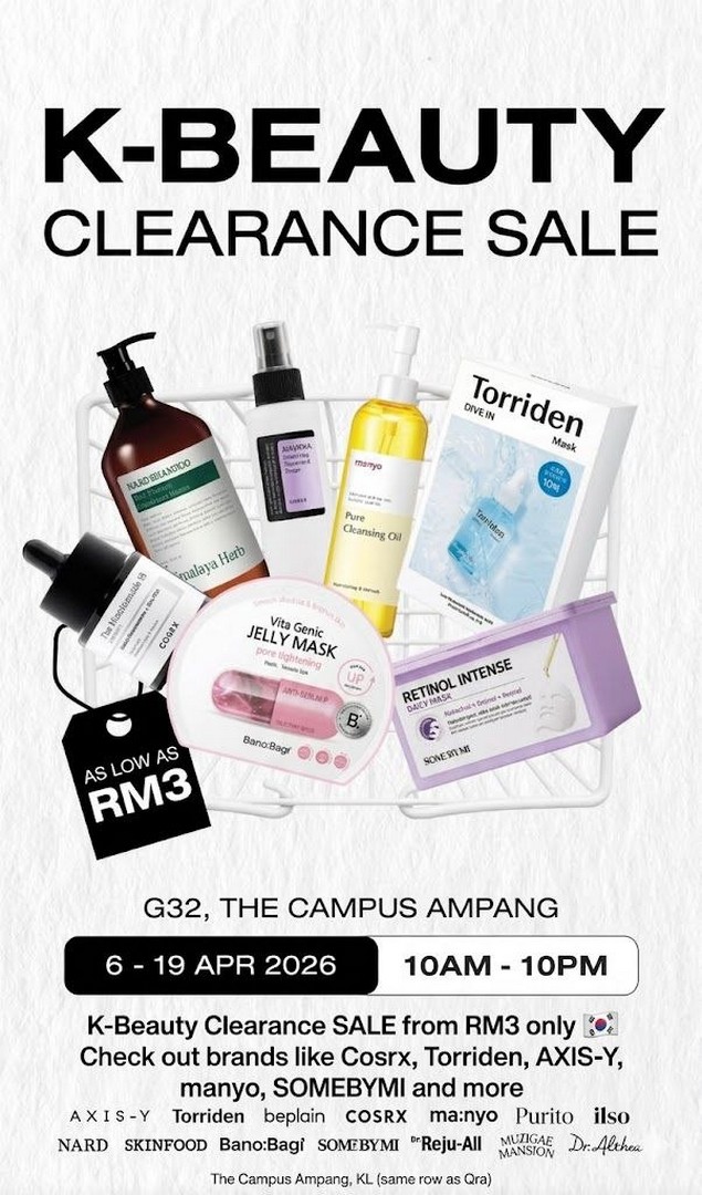 Taking place at The Campus Ampang, the K-Beauty Clearance Sale is shaping up to be one of the most exciting beauty deals this April. Running from 6 to 19 April 2026, daily from 10AM to 10PM, this event brings together a wide selection of well-loved Korean skincare brands at prices starting from as low as RM3. Yes, that is not a typo—RM3 for selected items, making it an incredibly attractive opportunity for bargain hunters and skincare enthusiasts alike.