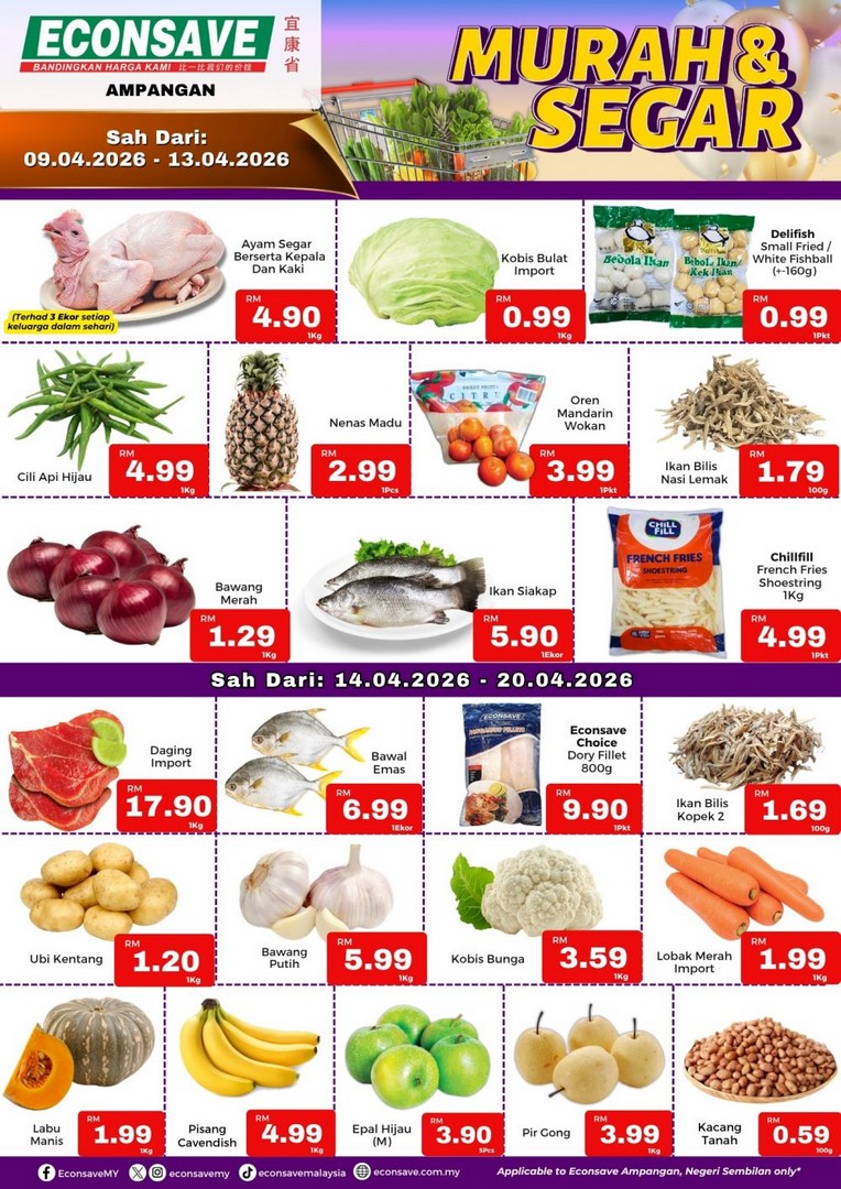 - 9 April 2026, 9:00 AM, Econsave Ampangan, Negeri Sembilan – Fresh Whole Chicken with Head & Feet RM1/bird (Limit 1 per family)