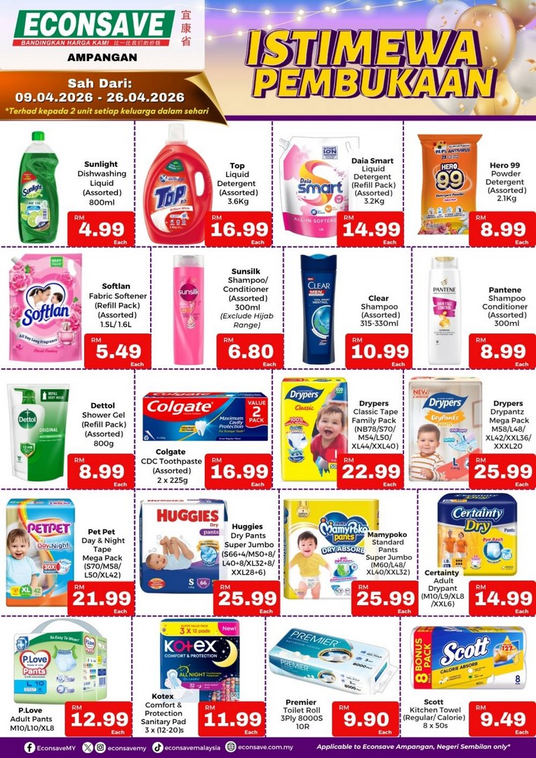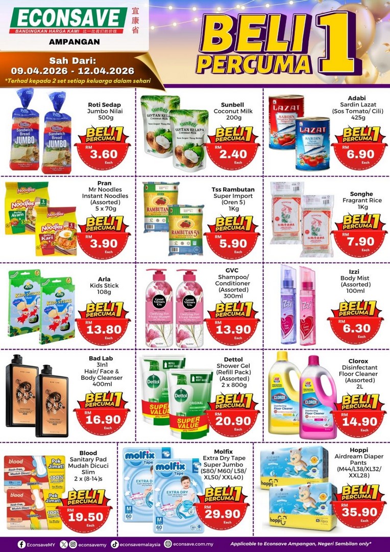 - 9-12 April 2026, Econsave Ampangan – Buy 1 Free 1 Deals on Roti Sedap Jumbo Nilai, Clorox Disinfectant Floor Cleaner, Dettol Shower Gel Refill, Molfix Extra Dry Tape Diapers