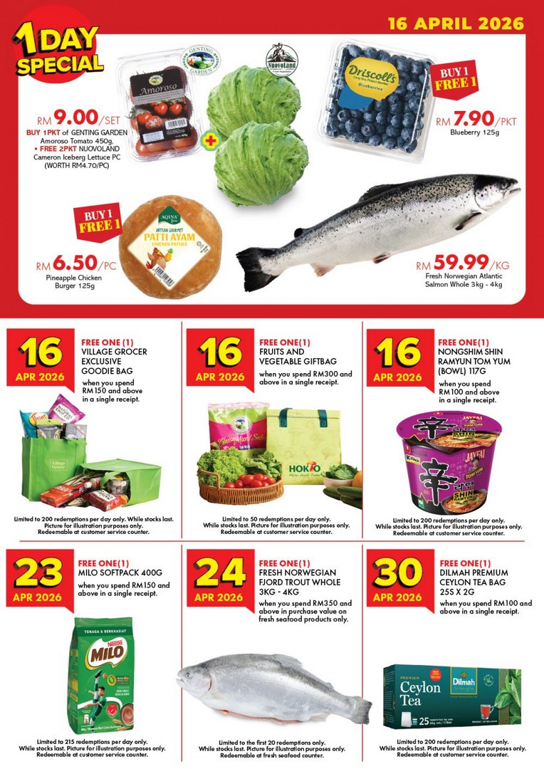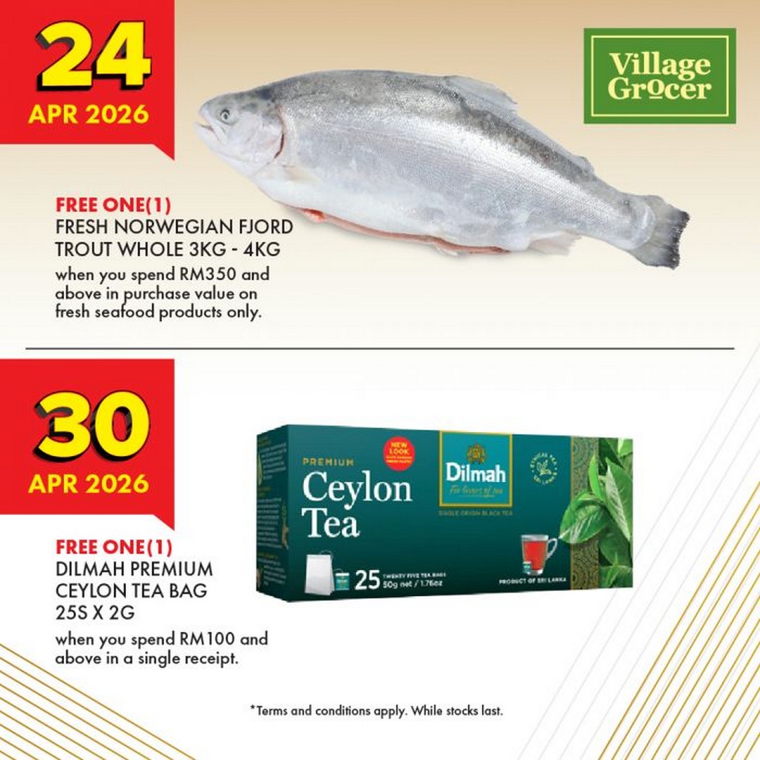 - 24 April: Free Fresh Norwegian Fjord Trout Whole (3–4kg) with a minimum spend of RM350 on fresh seafood products. Limited to first 20 redemptions.