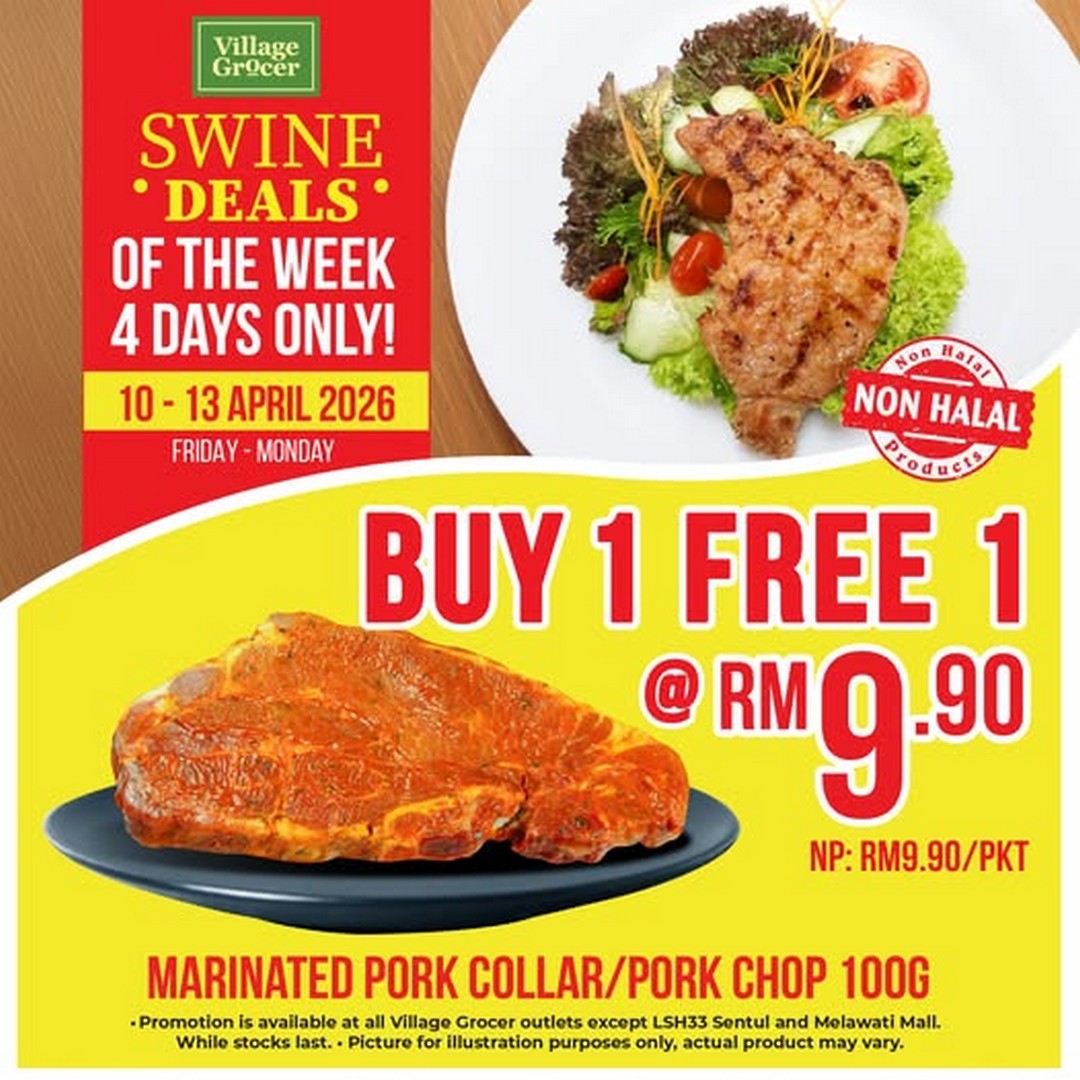 From 10 to 13 April 2026, Village Grocer is introducing a special “Swine Deals” promotion that is designed for customers who appreciate quality pork products at a more affordable price point. This campaign features a Buy 1 Free 1 offer on Marinated Pork Chop 100g, priced at just RM9.90 per pack. It is a short promotional window, but for those who enjoy planning their meals ahead or stocking up on convenient marinated meat options, this is the kind of deal that can make a noticeable difference to the weekly grocery budget.