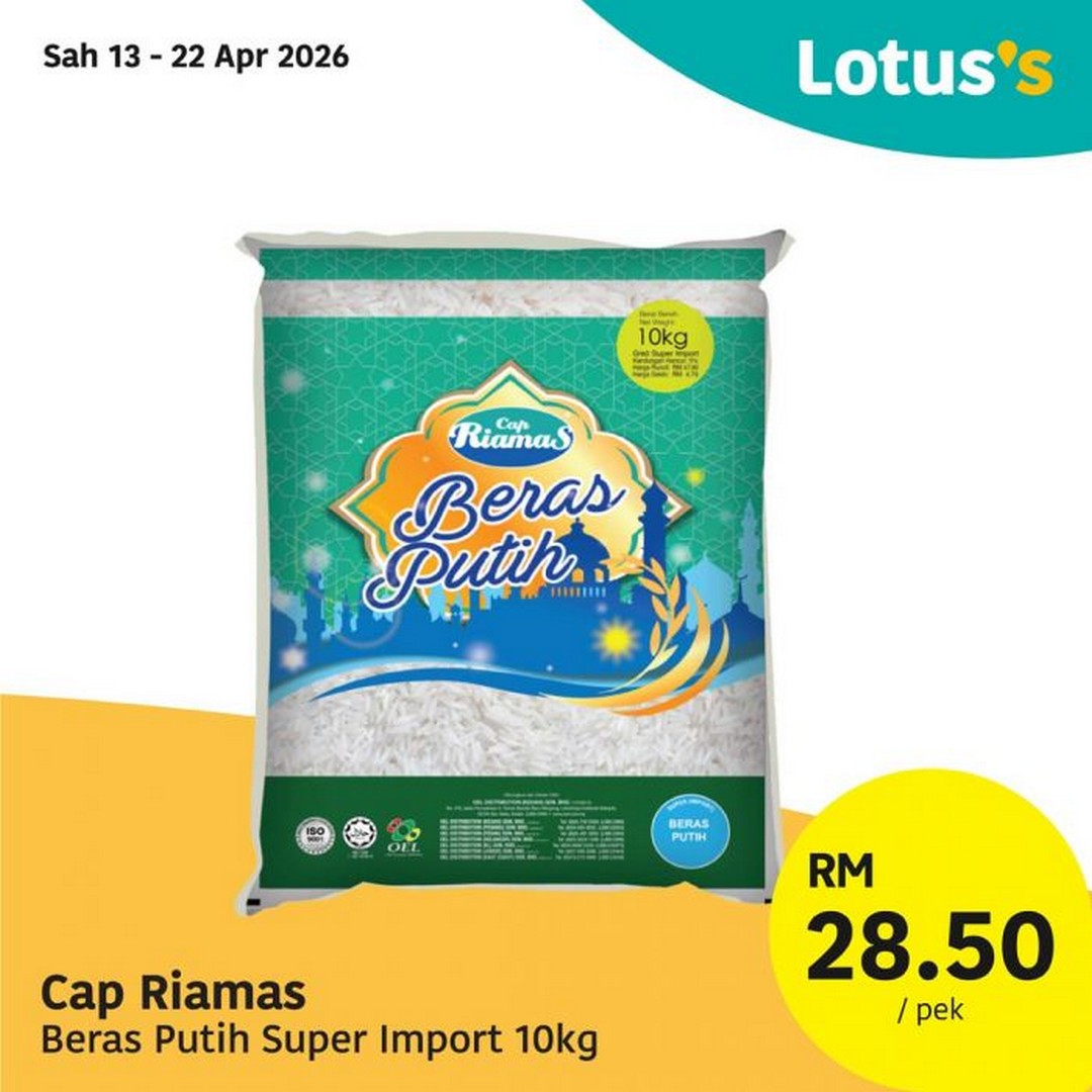 One of the standout deals is the Cap Riamas imported white rice 10kg pack priced at RM28.50, valid from 13 to 22 April 2026. Rice being a staple food in Malaysian households, this offer allows families to stock up at a lower-than-usual price point.