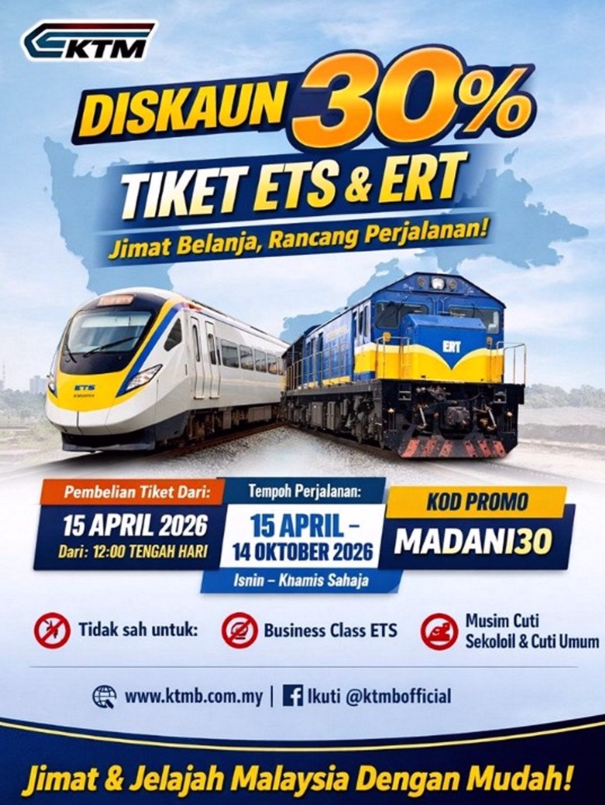 From 15 April to 14 October 2026, KTMB, together with the Ministry of Transport Malaysia, is offering a generous 30% discount on selected train tickets. This covers both the modern ETS service and the classic Ekspres Rakyat Timuran (ERT), making it an attractive option for anyone planning to explore Malaysia without stretching their budget too far.
