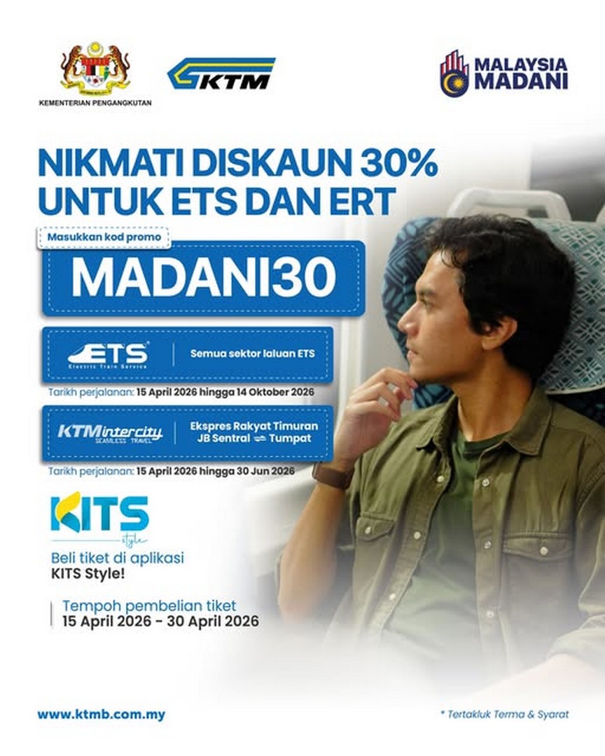 From now till the end of April, travellers can enjoy a generous 30% discount on selected train services, including the popular ETS (Electric Train Service) and the Express Rakyat Timuran (ERT). This is part of a collaboration with the Ministry of Transport (MOT), aimed at encouraging more people to travel domestically while enjoying the comfort and convenience of rail transport.