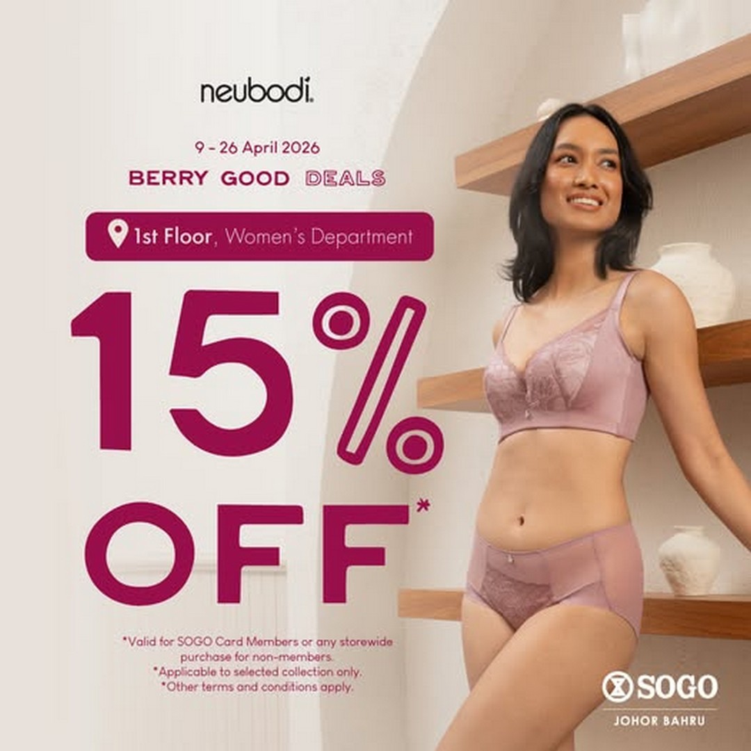 This Neubodi promotion at SOGO Johor Bahru is a simple yet valuable opportunity for anyone looking to refresh their lingerie collection. With 15% off selected bras in red, purple, and pink, it combines practicality with a touch of style. Running until 26 April 2026, it gives shoppers enough time to plan a visit, but not enough reason to delay too long.