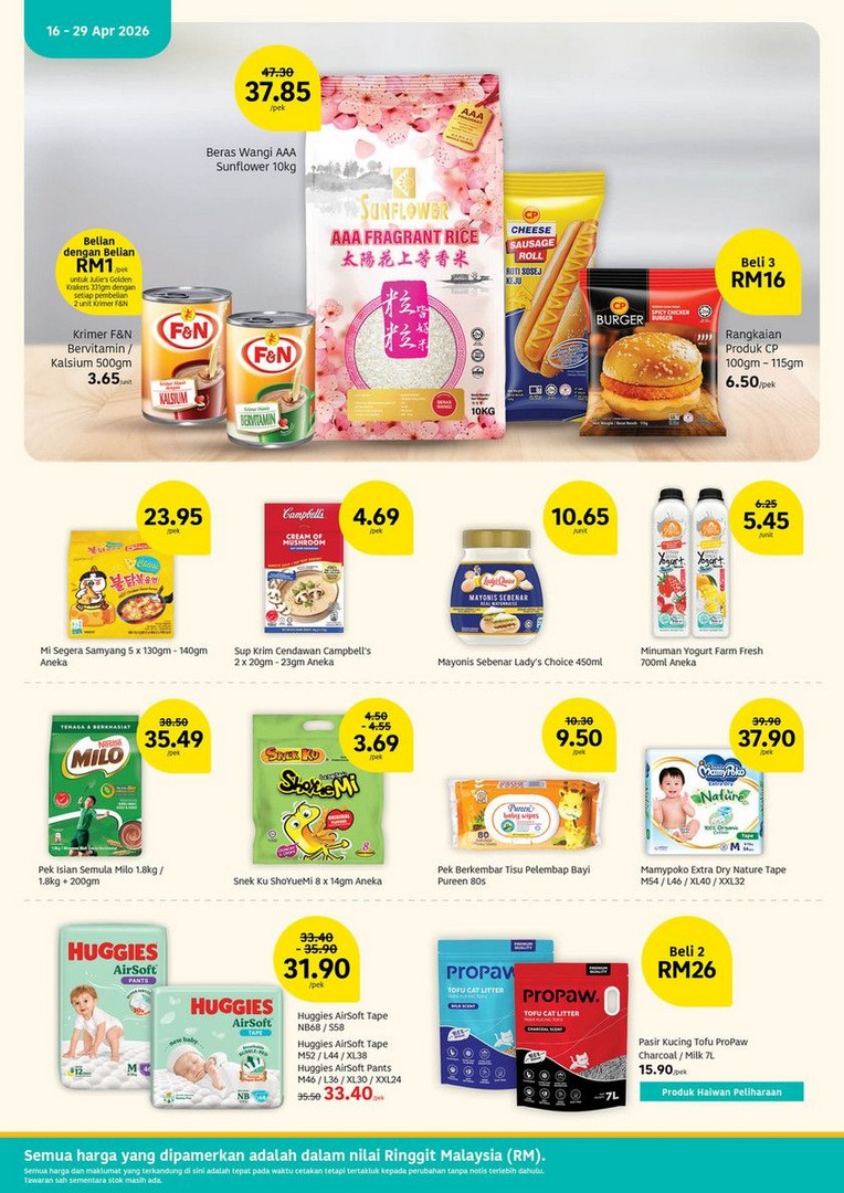 Beyond fresh produce, the promotion continues with the “Harga Hangat Groceries & Electronics” section running from 16 to 29 April 2026. This category is where bulk shopping becomes especially rewarding. Staples like Jasmine Siambest 5% Rice (10kg) at RM29.50 are ideal for households that consume rice daily. Laundry essentials such as Breeze Liquid Detergent 3.6kg at RM18.99 also help reduce recurring household costs.