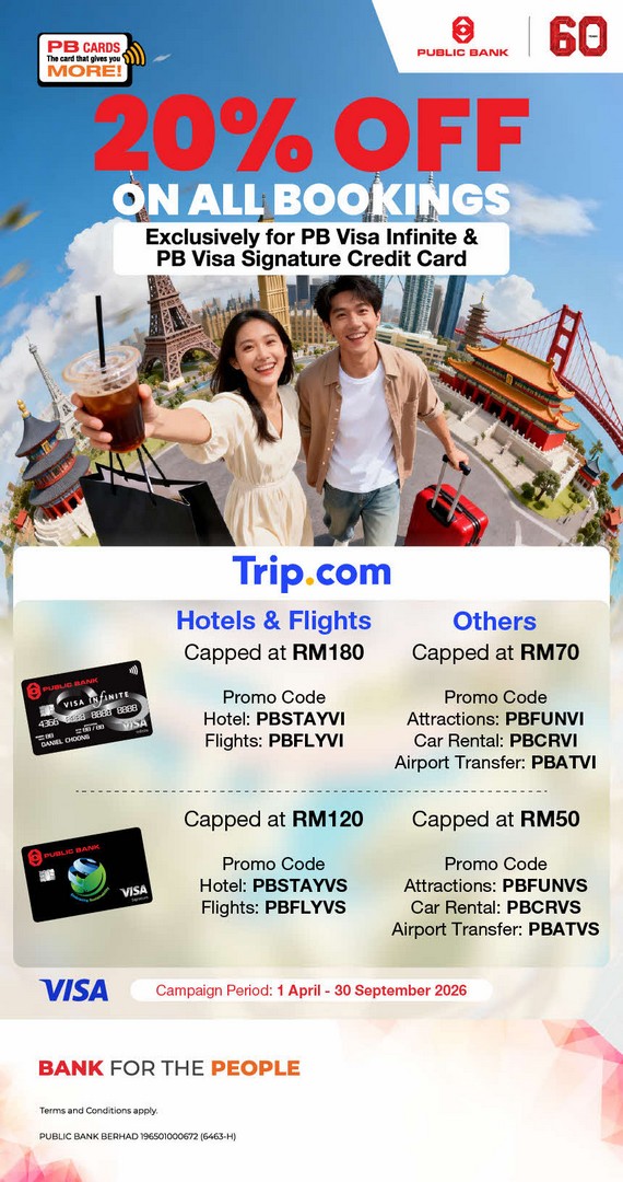 Running from 1 April 2026 to 30 September 2026, this campaign is exclusive to Public Bank Visa Infinite and Public Bank Visa Signature Credit Cardholders. In simple terms, it rewards those who already have these premium cards with better travel value when booking through Trip.com.
