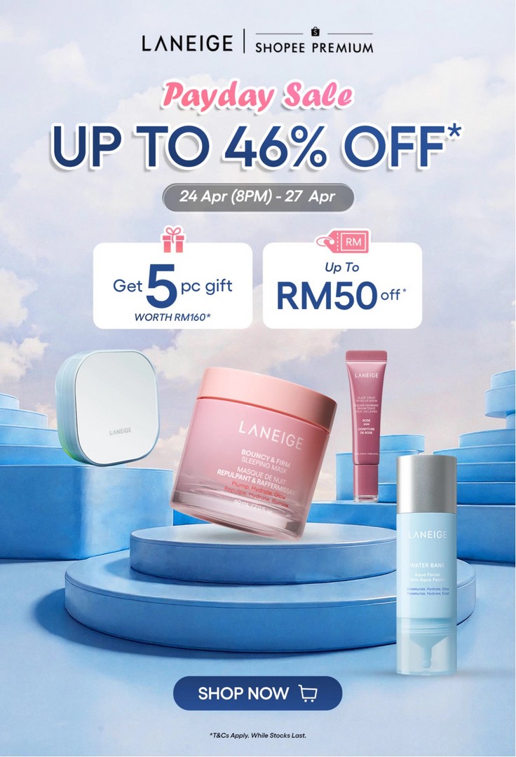 This coming payday season, there is something worth paying attention to if skincare is part of the monthly shopping list. From 24 April to 27 April 2026, Laneige is joining Shopee Premium Payday Sale, offering up to 46% off selected items, along with exclusive gifts worth up to RM160 and additional RM50 off vouchers on selected purchases. For those who have been waiting to restock their favourites or try Laneige for the first time, this is one of those limited windows that tends to attract a lot of attention.