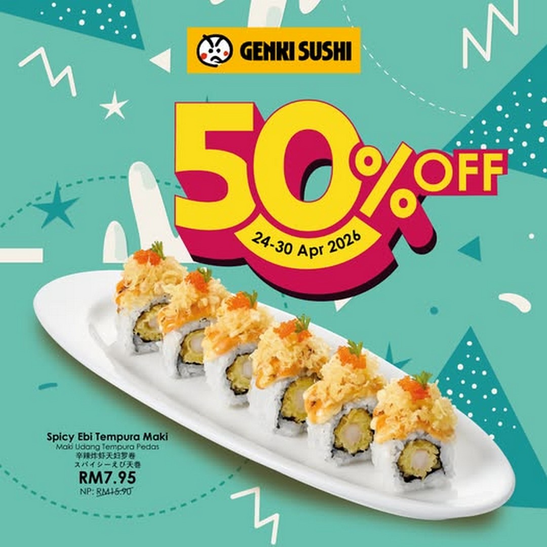 From 24 to 30 April 2026, Genki Sushi Malaysia is offering a special promotion that is hard to ignore. The spotlight of this campaign is the Spicy Ebi Tempura Maki, now priced at only RM7.95, which is 50% off the usual price. This is not just a small discount tucked away somewhere on the menu; it is a straight, no-nonsense half-price deal on one of their more popular sushi selections.