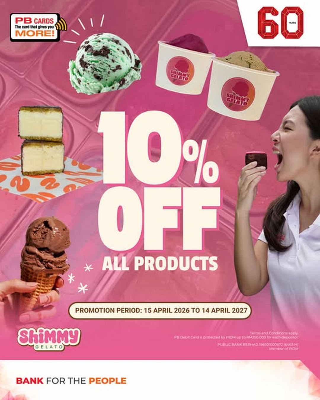 Public Bank has rolled out a long-running promotion that offers cardholders a 10% discount on all products at Shimmy Gelato, specifically at their outlets in Arcoris, Mont Kiara and Avenue K. What makes this promotion particularly attractive is not just the discount itself, but the duration. Running from 15 April 2026 all the way to 14 April 2027, this is not a limited-time weekend deal or a short festive campaign. It is a full-year opportunity to enjoy premium gelato at a slightly lighter cost.