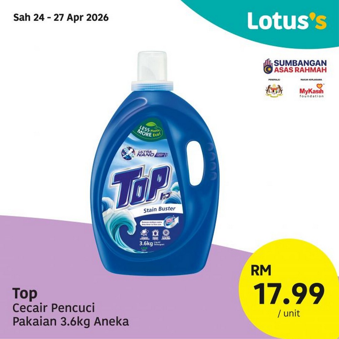 Top Cecair Pencuci Pakaian (3.6kg) at RM 17.99 per unit rounds up the essentials with household cleaning needs. Laundry detergent is another high-usage product, and promotions like this help reduce recurring monthly expenses.