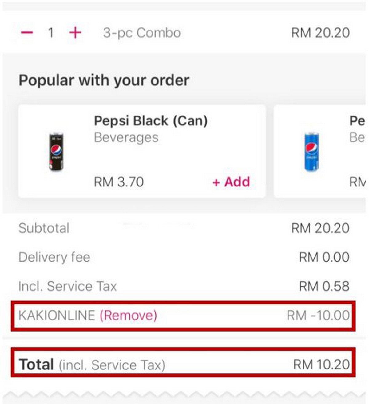 Step 6: 3-pc Combo two pieces of fried chicken set meal is only RM10.20 (including Delivery fee | Delivery fee depends on the region)