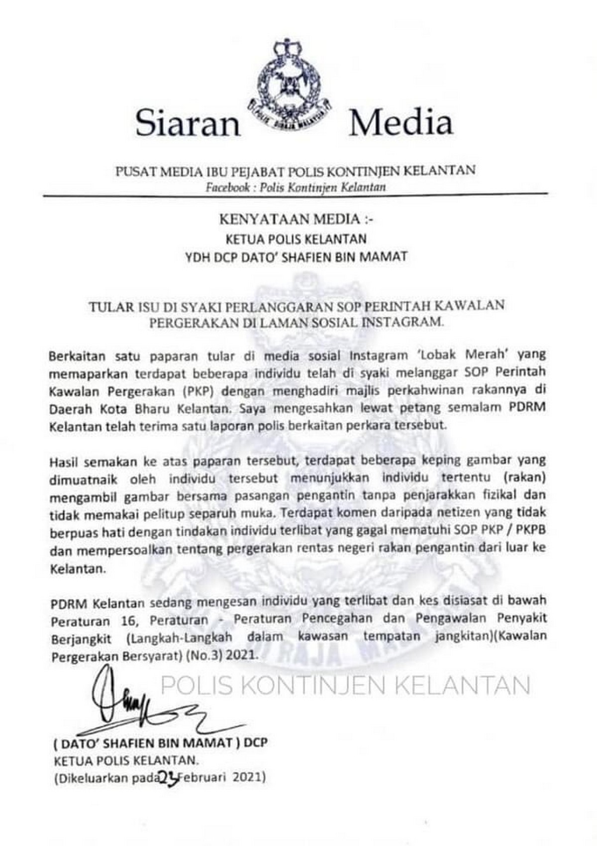 PDRM Kelantan is identifying the individuals involved and the case is being investigated according to the Prevention and Control of Infectious Diseases (Measures within Infected Local Areas) (Conditional Movement Control) Regulations 2021